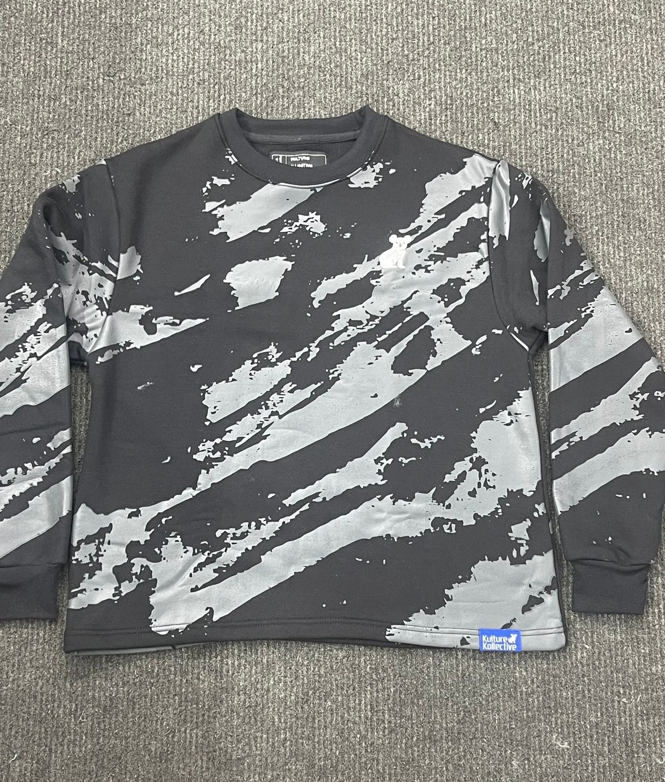 Elevate your streetwear with this sleek black krewneck, accented by bold diagonal grey paint strokes across the front and back. Designed for a modern, artistic vibe, this piece combines comfort with a statement-making aesthetic, perfect for layering or wearing solo. Its subtle yet striking pattern ensures you stand out while keeping a minimalist edge.