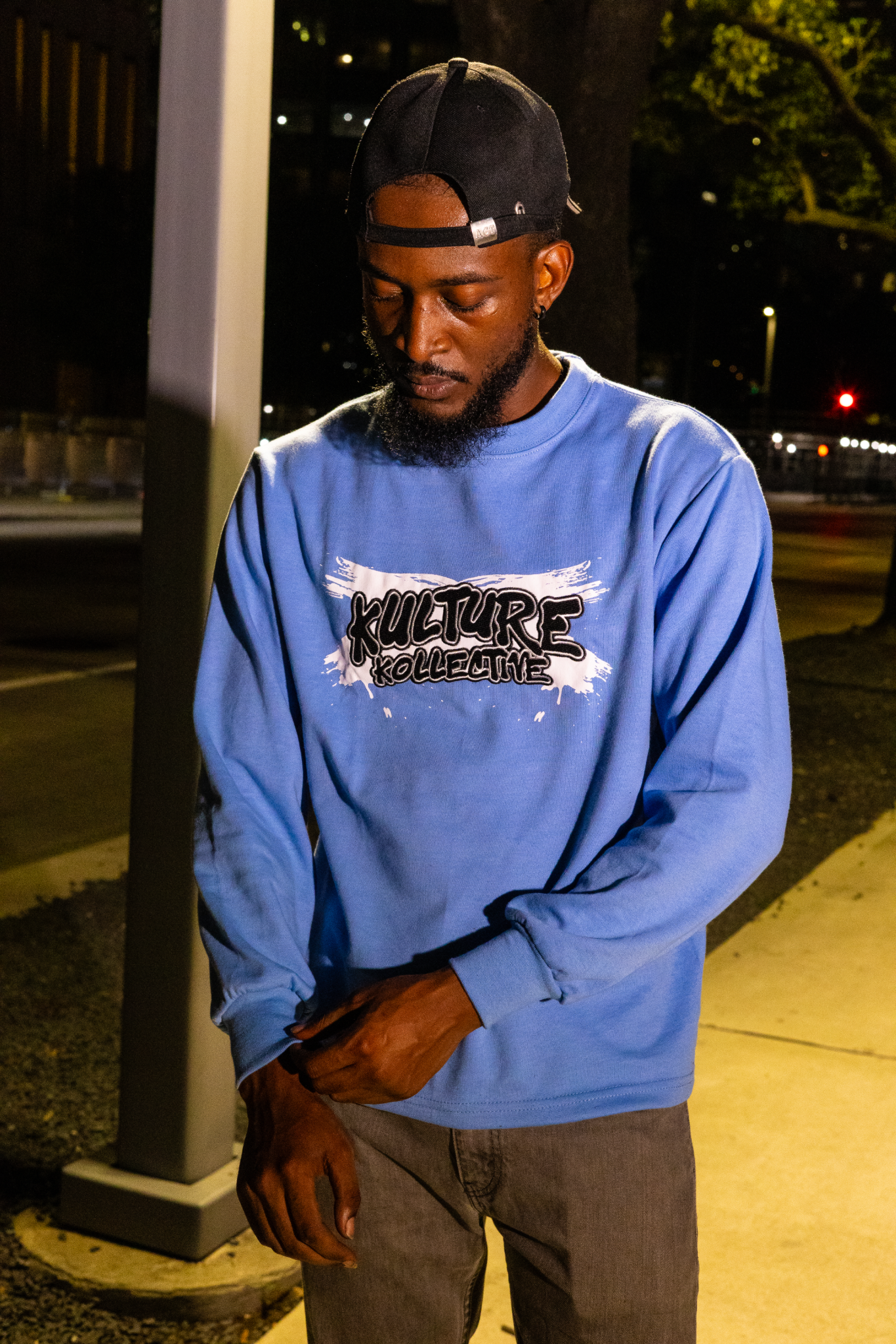 The design features a bold white background texture in screen printing, topped with raised black embroidery across the chest for a layered look that stands out. Finished with ribbed cuffs and a woven Kulture Kollective label at the hem, every detail is built to make a statement.